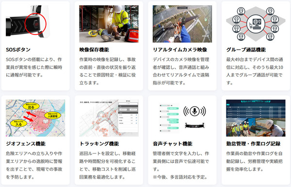 安全管理機能については、管理画面の地図上で設定したジオフェンス(Geofencing:仮想的な地理的境界線)を活用し、作業員の危険エリアへの立ち入りや作業エリアからの逸脱を検知するとアラートを鳴らして事故を未然に防ぐ。作業員が異常を感じた際に管理者に通報できるSOSボタンも備える。常時記録される映像は、万が一の事故発生時の原因特定や再発防止にも役立つ。