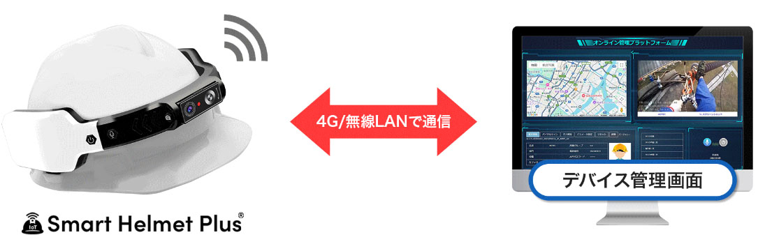 4G/無線LANによる通信機能、2100万画素のカメラ、マイク/スピーカー、GPSなどを備える。建設・土木現場など電源やネットワーク環境が整っていない場所でも単体で利用できる。同デバイスを装着したヘルメットをかぶった現場作業員と施設内の管理者がネットワークでリアルタイムにつながり、映像確認や指示・返答など、作業員の安全管理や労務管理を一元的に行える(図1)。