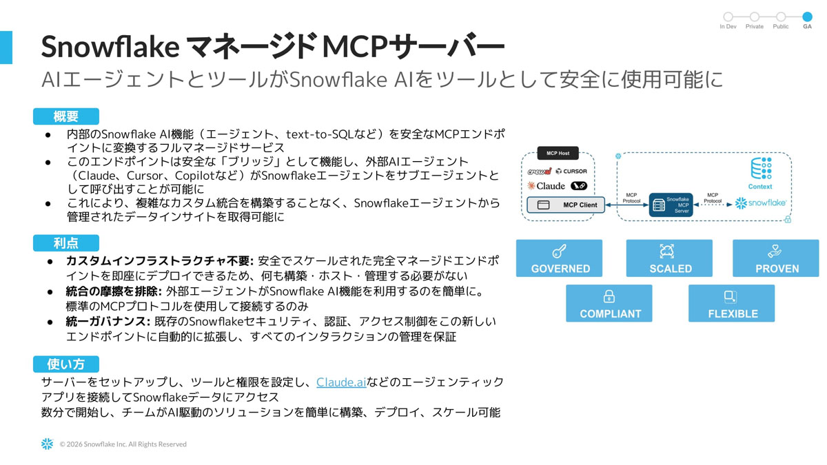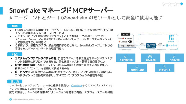 Snowflakeの機能をMCP(Model Context Protocol)のエンドポイントに変換するマネージド型のMCPサーバーの一般提供を開始している(図7)。