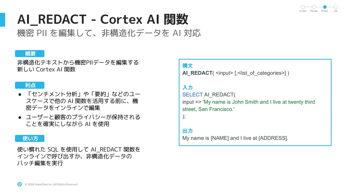SnowflakeのAI機能群であるCortex AI向けに、入力したデータに含まれる個人情報をマスキングする「AI_REDACT」関数を追加した。パブリックプレビューとして提供している(図3)。