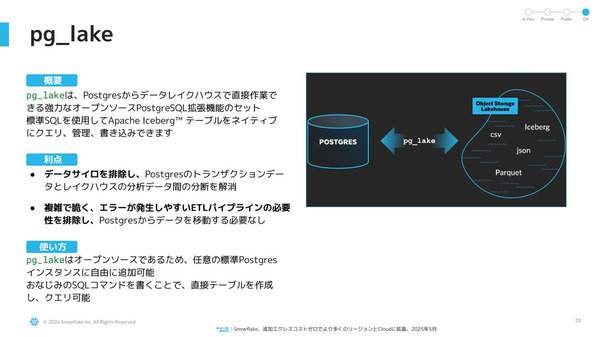 図2:IcebergテーブルにSQLでアクセスするためのPostgreSQL向け拡張機能「pg_lake」の概要(出典:Snowflake)拡大画像表示