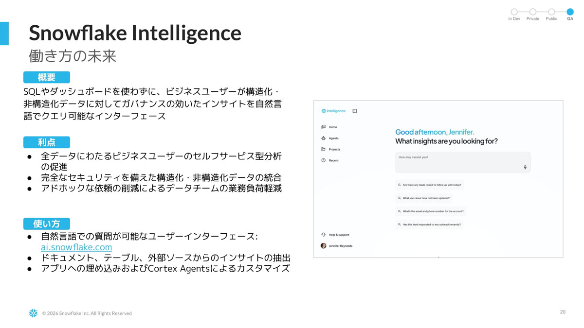 ユーザー向けのAI利用環境として、対話型のAIエージェント利用環境「Snowflake Intelligence」の一般提供を開始した(図6、関連記事:生成AIチャット「Snowflake Intelligence」に構造化/非構造化の両データを自然言語で検索できる新機能)。