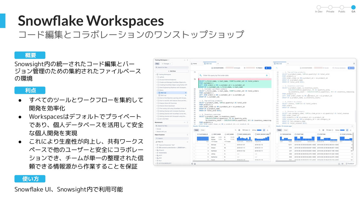 開発者向けでは、コードエディタやデバッグ/テスト機能、バージョン管理などを1画面に集約した開発環境「Snowflake Workspaces」を提供する。SQL実行結果を表だけでなくグラフで簡易表示する機能なども備える。一般提供を開始している(図4)。