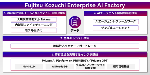 富士通は2026年1月26日、オンプレミス環境向け生成AIシステム「Fujitsu Kozuchi Enterprise AI Factory」を発表した。同年2月2日から先行トライアルの受け付けを開始、同年7月に正式提供を開始する。PCサーバーに、LLM、ファインチューニング支援ツール、AI開発ツールなどを組み合わせた垂直統合型アプライアンスパッケージとして提供する。LLMには富士通の「Takane」を採用し、ユーザー自身で精度向上を図れる「内製型ファインチューニング」機能を実装している。