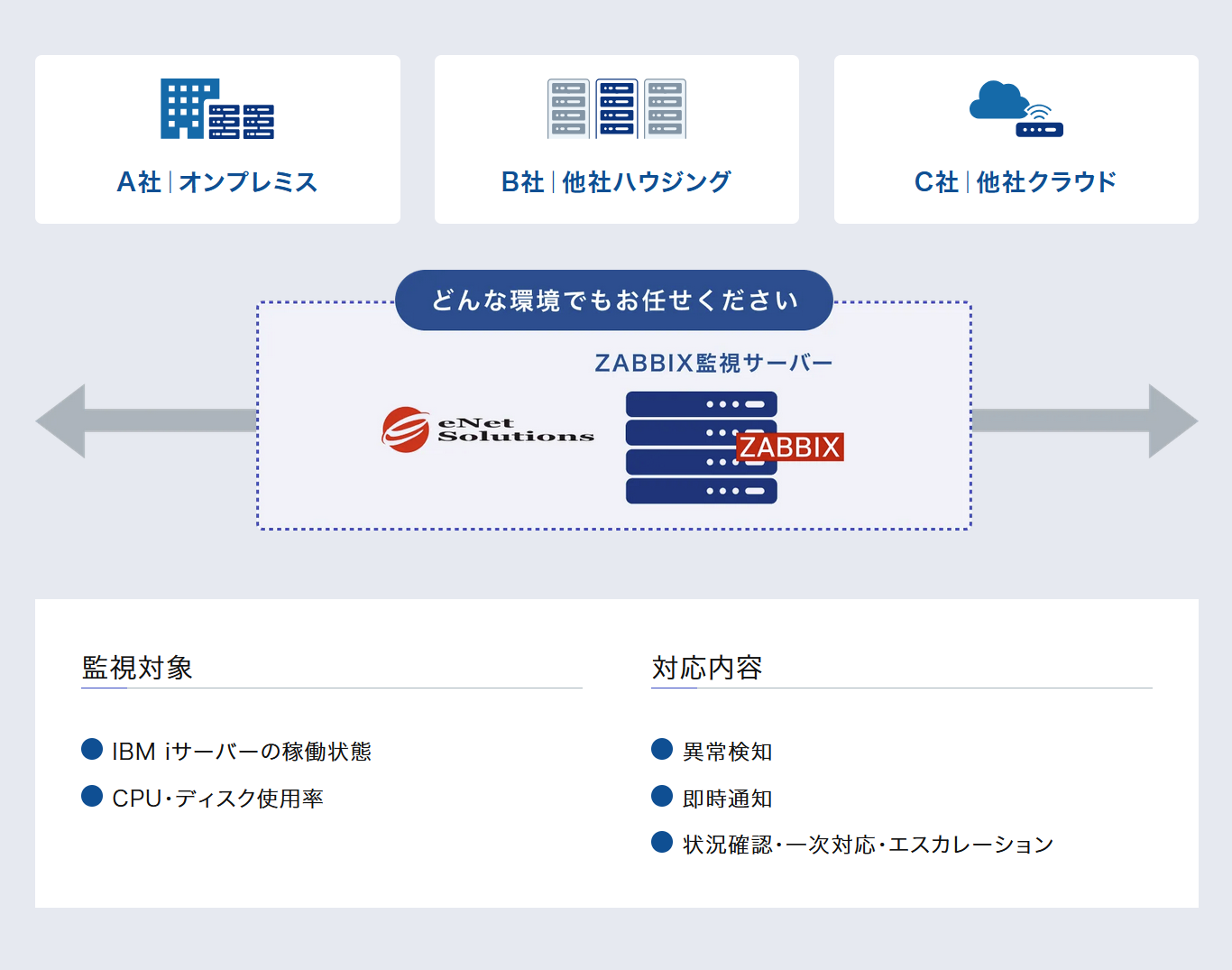 所在・環境を問わない導入:オンプレミス、データセンター(ハウジング)、クラウドなど、システムの所在を問わず導入が可能。既存の環境に大きな変更を加えることなく、運用監視体制のみを強化できる。