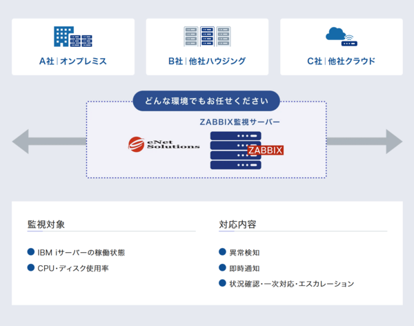 IBM iとオープン系の統合監視:IBM i専用のメッセージ監視やリソース監視に加え、WindowsやLinuxなどのオープン系サーバーも同一のスキームでの監視を請け負う。ユーザーは基幹システムと周辺システムが混在するハイブリッド環境を一括して委託できる。