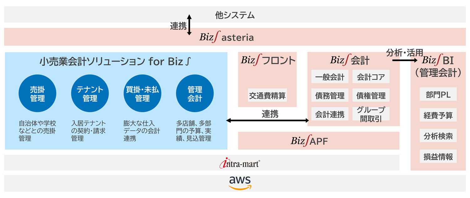 図1:「小売業会計ソリューションfor Biz∫」の全体図(出典:NTTデータ東北、NTTデータ・ビズインテグラル)拡大画像表示