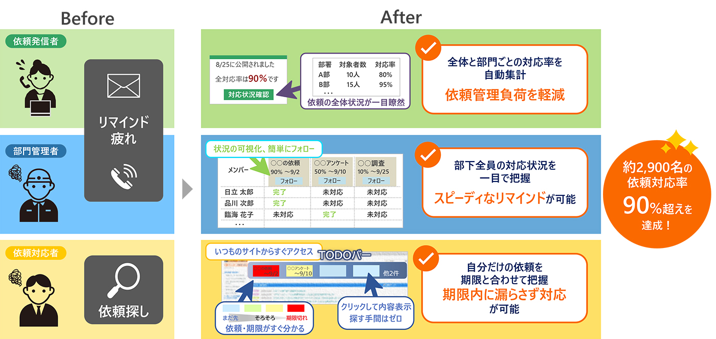 また、依頼発信側のメリットとして、部門別の対応率や未対応者数をタイムリーに把握できるようになった。ワンクリックでフォローが可能になったことで、コーポレート部門の業務負荷の軽減も図れた。