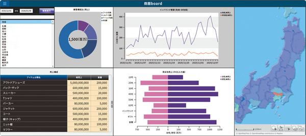 画面1:ゴールドウインが利用する商圏分析ダッシュボード画面。顧客構成比・インバウンド需要・売上構成・男女別売上のほか、地図機能によって店舗別売上構成と商圏の進捗を可視化している。画像はダミーデータを利用(出典:ウイングアーク1st)拡大画像表示