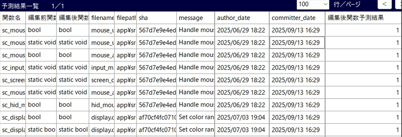 画面1:関数に不具合が含まれるかを予測した結果の一覧(出典:NTTデータ オートモビリジェンス研究所)拡大画像表示