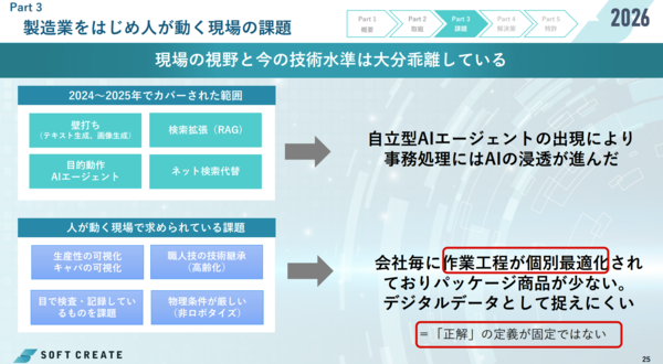 ソフトクリエイト 上席執行役員 企画統合部 統轄部長の鈴木大智氏(写真1)は調査から見えてくる課題を次のように指摘した。「製造現場では、工程判断や暗黙知の属人化、技能ギャップの拡大が深刻な問題になっている。特に複雑な工程を持つ現場では、作業の前後関係や全体の流れを把握し判断する必要があり、熟練者の経験と勘に依存しているのが現状だ」。