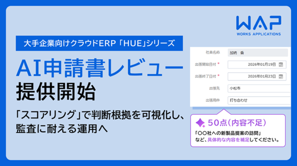 ワークスアプリケーションズ(WAP)は2026年2月5日、大手企業向けクラウド型ERP/会計アプリケーション「HUE AC」シリーズにおいて、生成AIを活用した新機能「AI申請書レビュー」の提供を開始した。経費精算や請求書払いなどの申請内容をAIがチェックし、社内規程に基づいてスコアリングすることで、不備や確認すべきポイントを可視化する。AIの判断根拠が監査証跡として残るため、経理部門や承認者は申請書を網羅的に確認する運用から脱し、判断が必要なポイントに集中できるとしている。