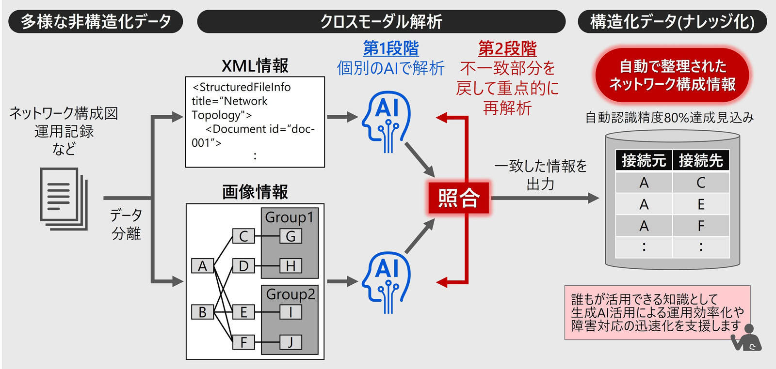 ファイル内部のXML情報と画像情報を組み合わせた「クロスモーダル解析」を用いることで、従来は活用が難しかった現場データの検索や再利用を可能にし、ネットワークの監視や障害対応、機器の設定変更、工事計画などに活用できるようにする(図1)。