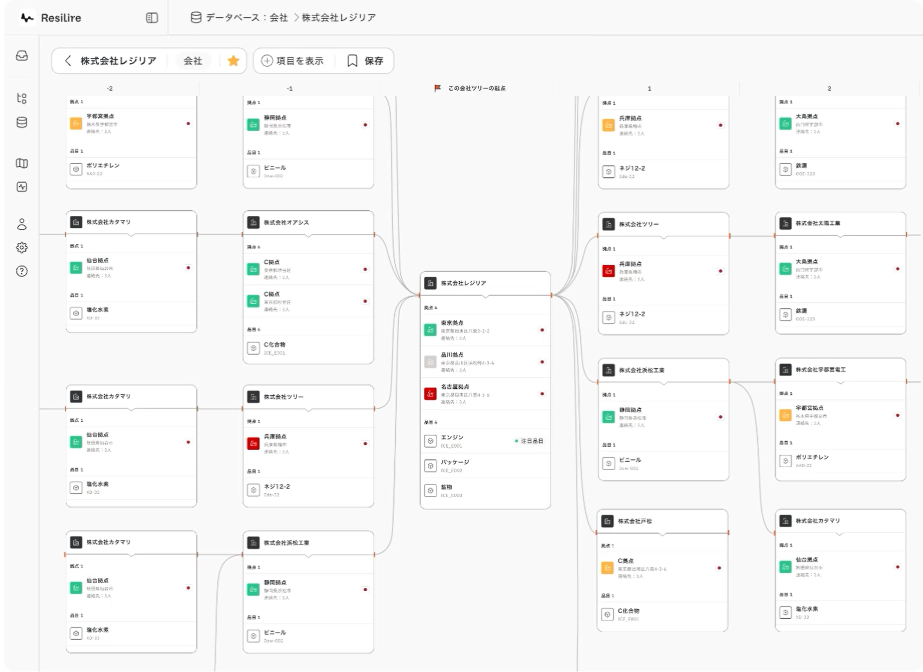 そこで、同社が導入したのが、サプライチェーンの上流から下流までを一元管理できるクラウドサービス(SaaS)「Resilire(レジリア)」(画面1)である。導入により、取引先データを効率的に管理し、サプライチェーンを多階層にわたって可視化することで、リスクの把握や影響範囲の特定を迅速化する。
