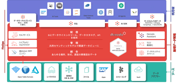 社内で進むデータ活用をより高度化すべく、Denodo Technologiesのデータ仮想化プラットフォーム「Denodo Platform」(図1)を導入した。オンプレミスとクラウドに散在していたデータを仮想的に統合している。日鉄ソリューションズ(NSSOL)の支援の下、PoC(概念検証)を経て2025年6月に稼働を開始した(関連記事:Denodoが訴える、AI本格活用期にデータ仮想化がもたらす価値)。