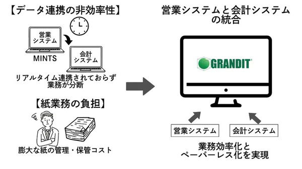 こうした中、営業システムのサーバーOSがサポート終了を迎えることを契機に、これらの課題を解消すべく基幹業務システムの刷新を決定。国産のERPアプリケーション「GRANDIT」を採用し、営業システムと会計システムの統合を図ることにした。