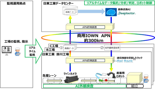 電気機械器具の製造販売を手がける日東工業は、画像認識AIを約300km離れた遠隔で実行し、外観検査に成功した。工場同士をNTTのAPN(All-Photonics Network:全光ネットワーク)「IOWN APN」で結ぶことで、ローカル環境と遜色ない速度と品質で画像データ解析とロボットアーム制御を実現した。AIシステムを遠隔データセンターに集約できるようになるとしている。