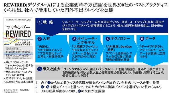 2024年、マッキンゼーは『REWIRED』という書籍を上梓した。本書は、世界200社以上のプロジェクト実績からベストプラクティスを抽出し、デジタルやAIによる企業変革を成功させるための方法論を体系化したものだ(図1)。