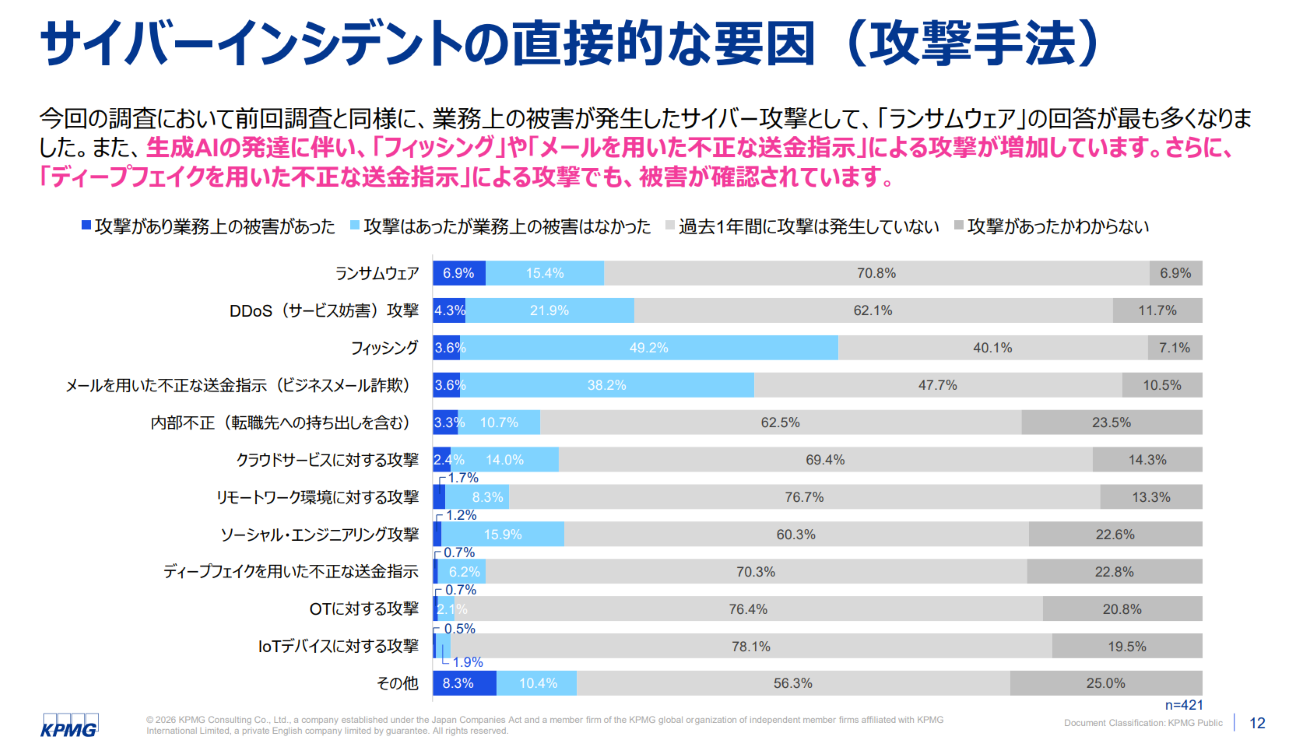 KPMGジャパンは2026年2月17日、年次セキュリティレポート「サイバーセキュリティサーベイ2026」の調査結果の概要を発表した。調査ではサイバー攻撃の「被害額10億円以上」の事例が確認されるなど、ランサムウェアをはじめとするサイバー攻撃被害の巨額化が一層進んでいる。生成AIを悪用した、見分けのつかない詐欺メールやディープフェイクの脅威に取り囲まれる中で、多くの組織ではセキュリティ予算や推進組織の人員が不足している現状が浮き彫りになった。