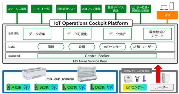 スーパーマーケットチェーン運営のベイシア(本部:群馬県前橋市)は、店舗内にある冷蔵・冷凍設備の温度管理をIoTを活用して自動化した。富士通の支援の下、各種IoTセンサーから取得したデータをリアルタイムに可視化するシステムを構築。同年5月までにベイシア全138店舗に導入する。店舗従業員による温度の点検・記録業務をなくし、異常時の迅速なアラート通知による食品ロスの削減を見込む。ベイシアと富士通が2026年2月25日に発表した。