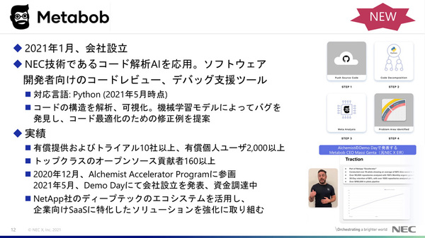 Metabobを提供している米Metabobは、NECの子会社で新事業の創出を推進する米NEC Xによる事業の1つである(図1)。Pythonコードのバグを機械学習で特定する(関連記事:NEC、「Visual Studio Code」の拡張機能で、AIが生成したソースコードのバグ検出と修正提案)。