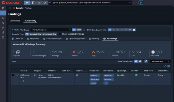 Tanium Platformは、エンドポイントセキュリティ状況のリモート調査機能、セキュリティ面で問題のあるエンドポイントを制御して問題を除去する機能を中核とする。ある脆弱性に対するセキュリティパッチが未適用のエンドポイントをリストアップしてパッチを適用するといった措置が可能になる。