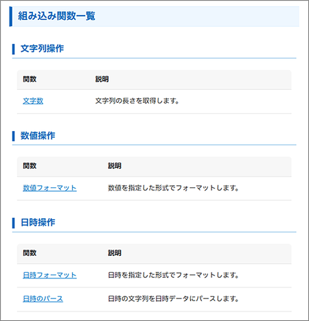 また、フロー上に配置したアイテムごとにエラー発生時の動作を指定できる柔軟なエラー処理機能を追加した。データの加工や変換を容易にするJavaScriptの組み込み関数(画面4)も提供する。今後のバージョンアップで関数種類をさらに拡充予定としている。