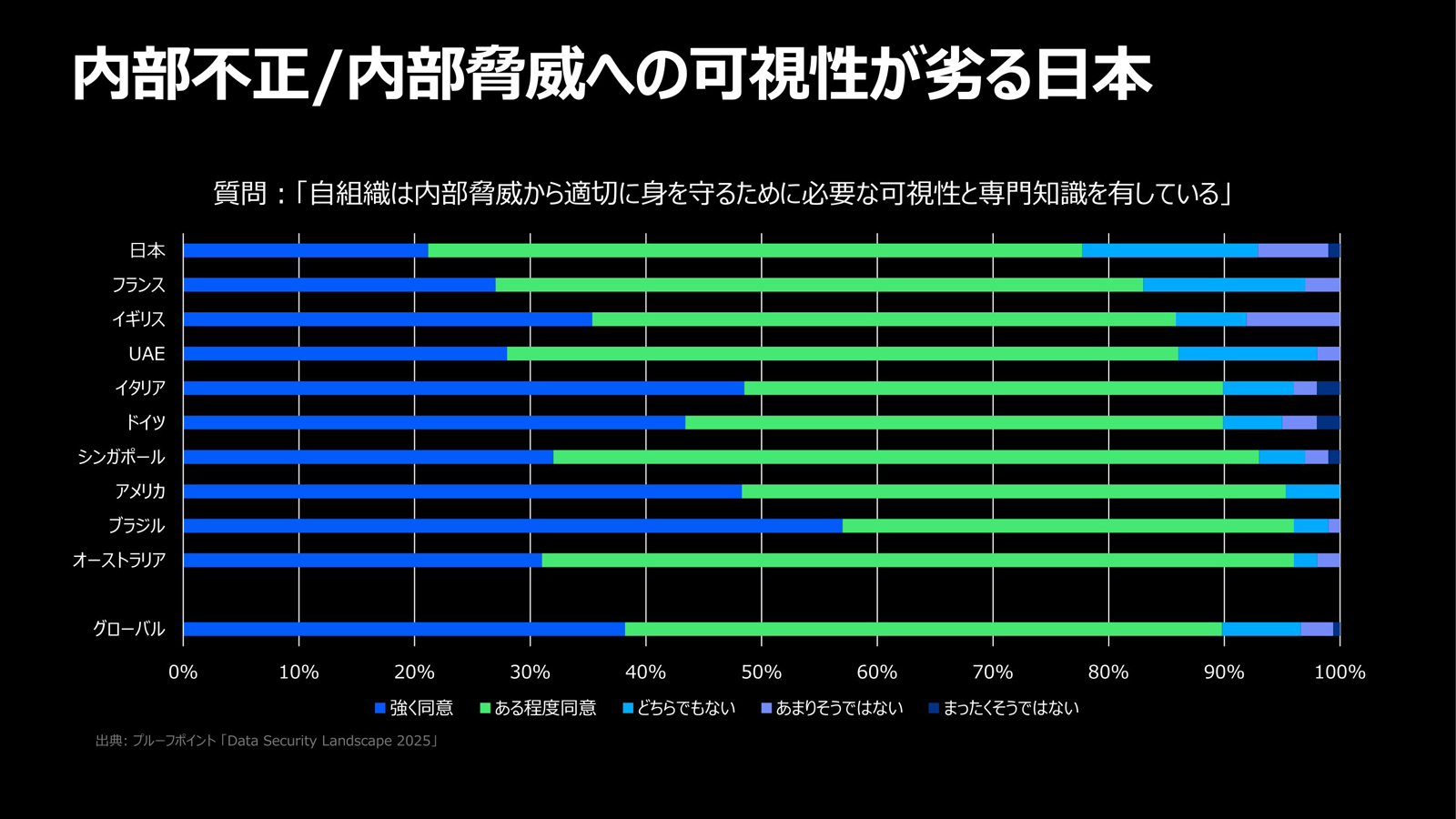 自組織が内部脅威から適切に身を守るために必要な可視性と専門知識を持っているかを聞いたところ、日本は他の地域よりも劣るという結果になった(図5)。