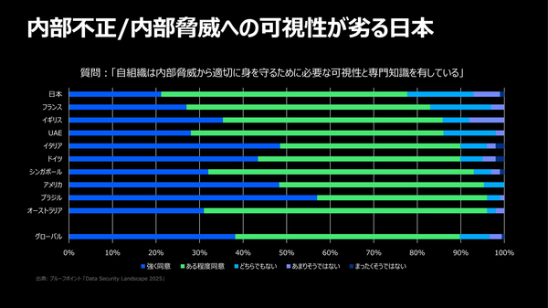 図5:内部不正/内部脅威への可視性と専門知識における日本とグローバルの差異(出典:日本プルーフポイント)拡大画像表示