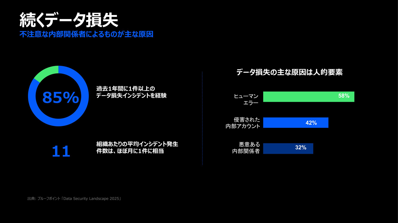 データ損失の主な原因は人的要素である。1位はヒューマンエラーで58%、侵害された内部アカウントによるものは42%、悪意ある内部関係者による故意のデータ漏洩も32%ある(図3)。