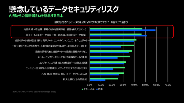 図4は、懸念しているデータセキュリティリスクを尋ねた結果だ。日本はグローバルと比べて内部脅威とメール経由のデータ損失が突出して高かった。