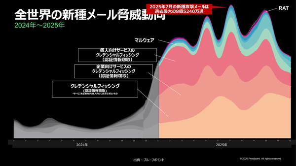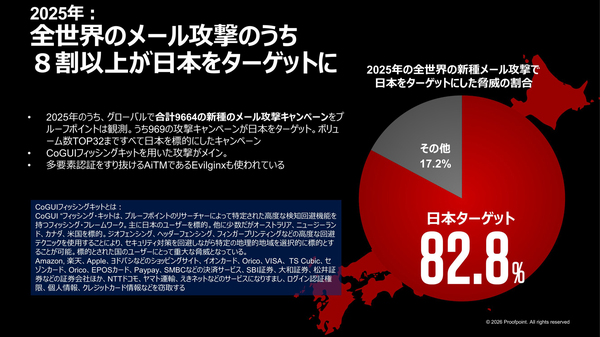 図2:2025年に観測した新種メール攻撃キャンペーンの8割超は日本がターゲット(出典:日本プルーフポイント)拡大画像表示