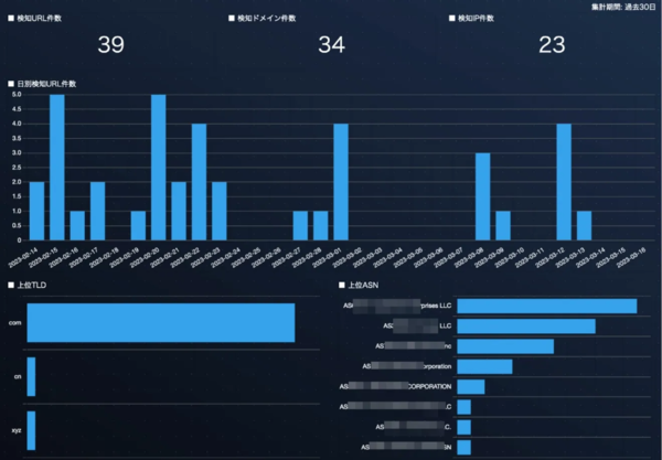 画面1は、PHISHNET/25のダッシュボード画面の例である。さまざまなデータソースから収集した情報や、Webクローリングにより得られた情報を独自ロジックで分析・判定し、ダッシュボードに提示する。フィッシングメールやSMSが送られる前に顧客へ注意喚起のアナウンスをするなどの対策を可能にする。