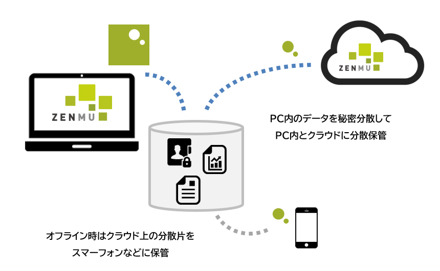 ZENMU Virtual Driveは、Windows PCの仮想ドライブにデータを保存すると、ファイルを2つに分割し、1片をPCの内蔵ディスクに、もう1片を専用のクラウドストレージ(ZENMUクラウドサービス)やUSBメモリー/iPhoneなどの外部ストレージに分散保管する仕組みを持つ。両方が揃わないとデータを読み取れないので、1片が漏洩しても情報は漏洩しない。また、管理者が遠隔でロックすることで、PCのデータへのアクセスを不能な状態にでき、万が一PCを紛失・盗難にあっても情報漏洩を防ぐことができる(図1)。