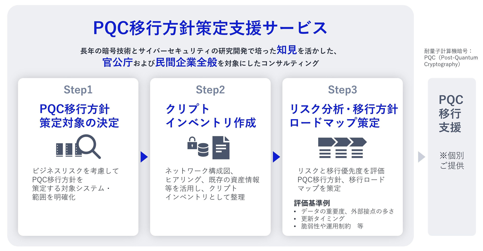 PQC移行方針策定支援サービスは、スポット型コンサルティングサービスの形態で提供する。標準的なサービス期間は3カ月からで、対象範囲と規模に応じて個別に調整する。以下の3つのステップでPQCへの移行を支援する。