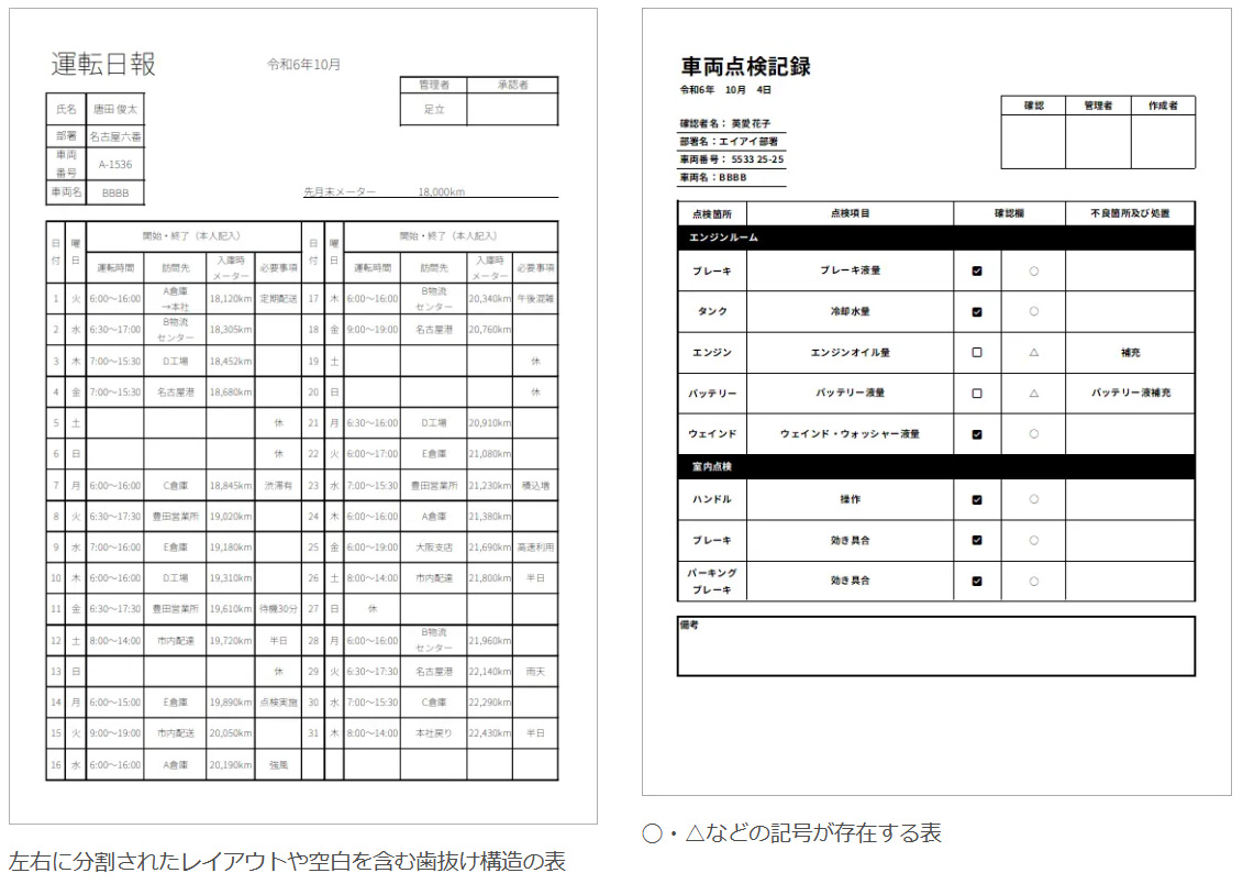 運送業界では従来、ドライバーが運転日報や車両点検記録を日々記入し、これを営業所で回収してExcelや基幹システムへと転記・登録していた。これらの帳票は、左右に分かれた特殊な表構造や歯抜け形式のレイアウトになっていることが多く、記号や手書き記入、略記も含んでいる。従来のAI-OCRでは安定した読み取りが難しく、人手による入力を前提とした運用が続いていた。
