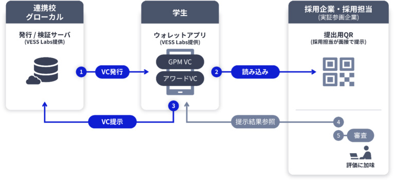 取り組みの第1弾として、就職活動中の学生と地元企業のマッチングをDID/VCで促進する実証実験を2026年4月1日に始める(図2)。実証に参画する企業の採用面接で、指定するVCを学生が面接時に提示する。選考企業は、これを選考評価に加味する。現在、京都府内で取り組みに参画する企業と教育機関を募集中である。