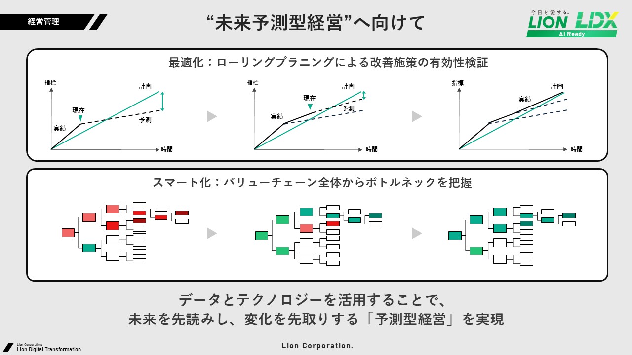 図2:未来予測に基づいて計画の達成を支援する取り組みと、機械学習によってボトルネックを把握する取り組み(出典:ライオン)拡大画像表示