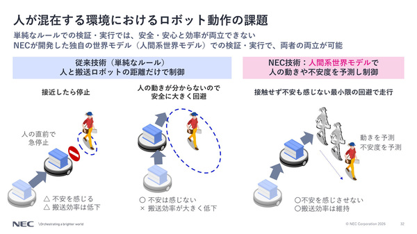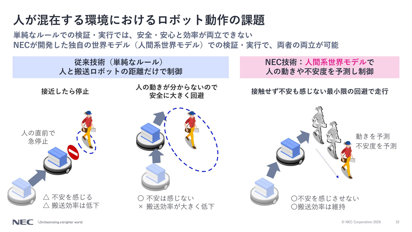 NECは2026年3月12日、産業現場で働く人とロボットが不安なく協働できる環境を支援する技術を発表した。人の動きと心理状態を予測する独自の「人間系世界モデル」を活用し、人の不安の程度を定量的に推定。そのうえで、不安を高めないように先回りしてロボットを制御するフィジカルAIを開発している。ロボットと人の相対的な位置・姿勢から人の進行方向や不安の程度をリアルタイムで予測し、不安を軽減できる経路や速度で自律走行する。2027年度中の実用化を目指す。合わせて、個々人の作業内容を時系列で把握できるようにするデジタルツイン技術を開発している。