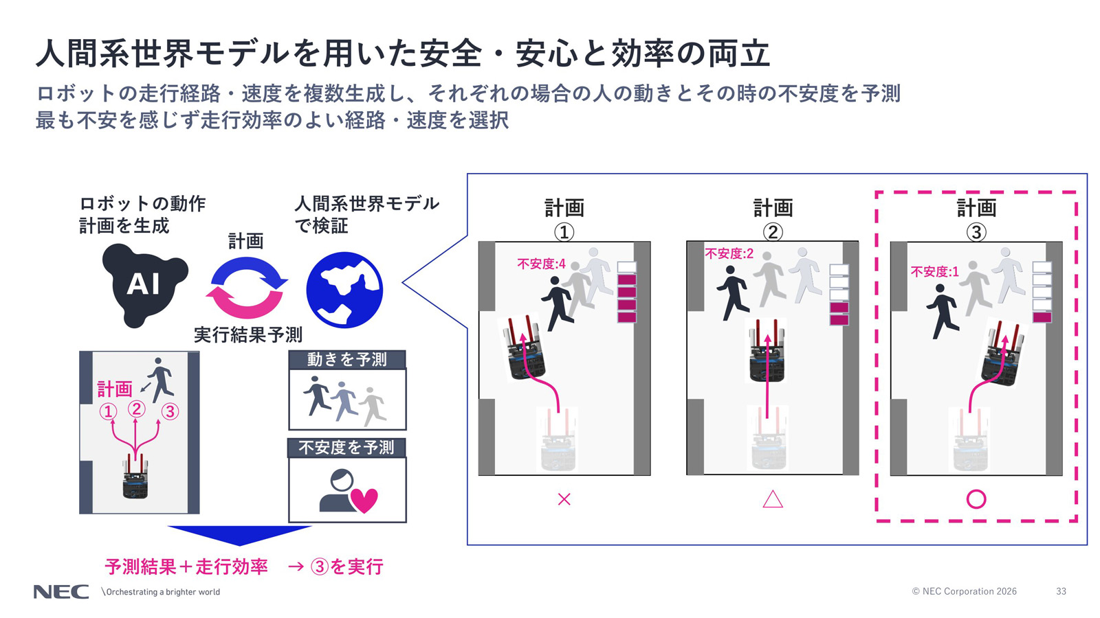 NEC、「人間系世界モデル」を活用したフィジカルAIを開発、人とロボットが“ぶつかる不安”を予測して回避
