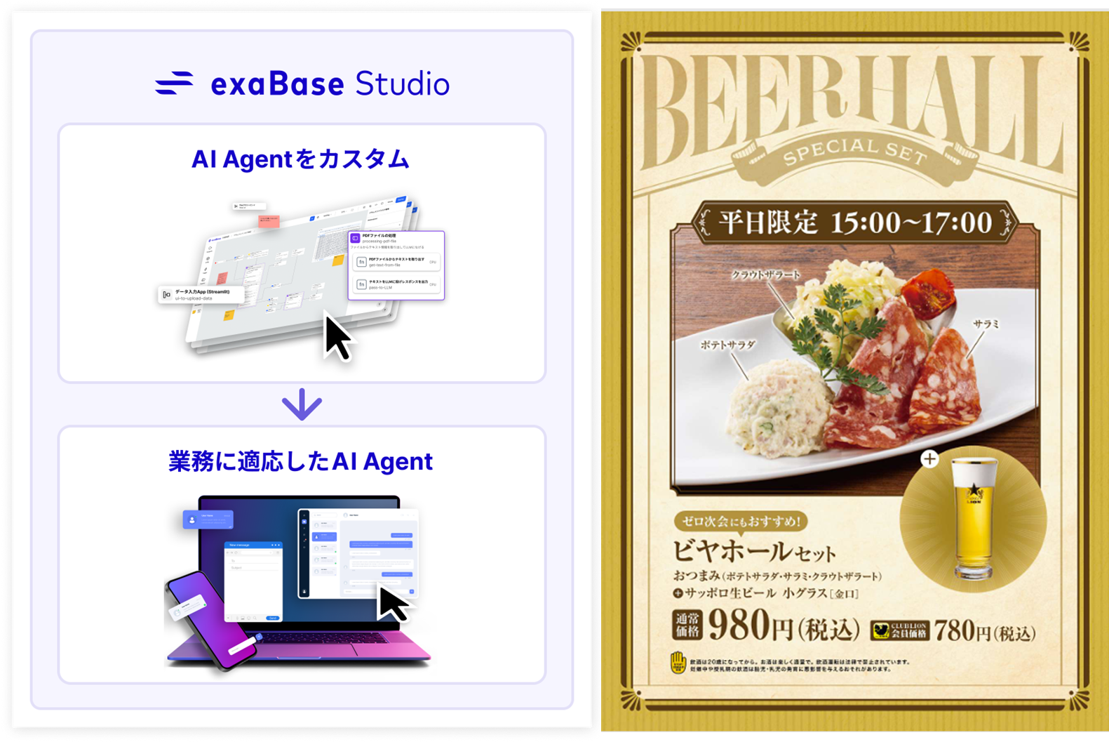 サッポロホールディングス(本社:東京都渋谷区)は2026年3月16日、グループ企業であるサッポロライオンの「銀座ライオン 渋谷マークシティ店」において、AIエージェントが生成したマーケティング施策のテスト展開を開始した。AIエージェント開発・運用ツール「exaBase Studio」を活用し、購買データ分析から施策案生成までをAIエージェントで代替する。