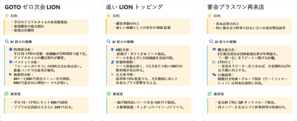 データ分析に基いてAIエージェントが導いた施策案の一例は、図2の通りである。このうち平日のアイドルタイムの来客店増加などを狙った「GOTOゼロ次会LION」施策を今回適用した。
