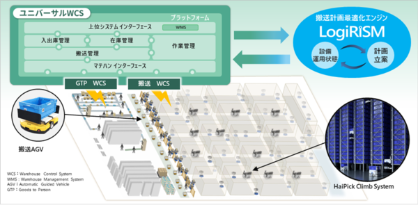 特徴は、入庫から出荷、在庫管理に至る倉庫内の作業全体を最適化するため、複数設備を一元的に統合制御する日立製作所の統合型マテハン制御システム「ユニバーサル WCS」を導入したこと(図1)。さらに、搬送計画最適化AIエンジン「LogiRiSM」と連携し、オーダーの投入順序や搬送ルートをリアルタイムに最適化する(関連記事:日立、複数のマテハン機器を連携させた搬送計画を自動立案するAIエンジン「LogiRiSM」)。