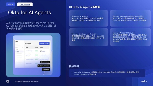 Okta Japanは2026年3月17日、AIエージェント向けID管理機能「Okta for AI Agents」を発表した。人を認証するようにAIエージェントを認証し、SaaSなど外部システムへのアクセス権限を管理する。AIエージェントが各種システムに際限なくアクセスしている状況を改善する。同機能は、クラウド型ID管理サービス「Okta Workforce Identity」の新機能として動作する。同年4月30日(米国現地時間)から提供を開始する。
