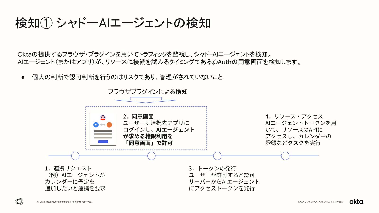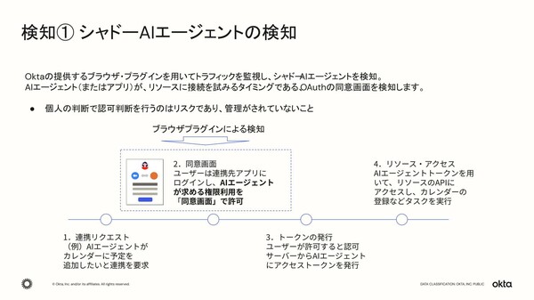 図3は、AIエージェントにアクセス権限を与える処理の流れの例である。シャドーAIエージェントがSaaSにアクセスした際に出るOAuth認可の同意画面をブラウザプラグインが検知し、認可プロセスにOktaを介入させる。AIエージェントは、Oktaが発行したトークンを利用してSaaSにアクセスする。一度検知したシャドーAIエージェントをOktaに登録してOktaの管理下に置くことも可能である。