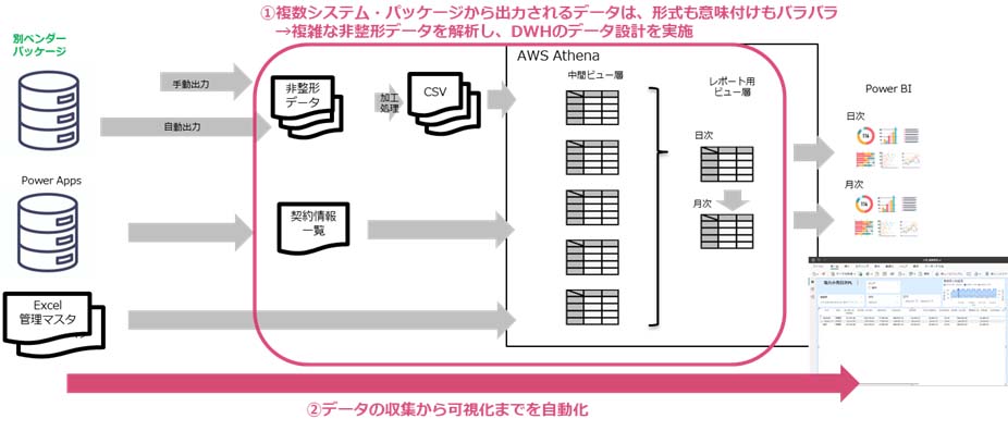 開発したシステムは、複数のシステムが出力する、形式や意味付けが不統一な非構造化データを解析して連携する(図1)。データの加工やレポート作成の作業が不要になり、タイムリーにデータを可視化できるようになった。