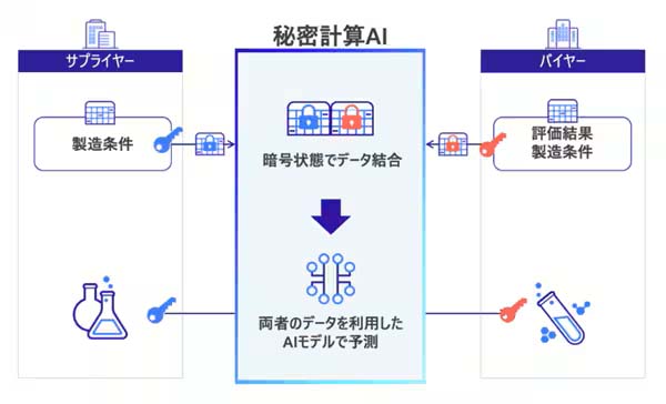 背景として、マテリアルズ・インフォマティクス(MI)の高度化には、企業同士のデータ連携が鍵となる。サプライヤが持つ製造条件と、バイヤーが持つ評価データを連携できれば、開発効率が上がる。しかし、各社が保持する重要な技術やノウハウが流出するリスクがある。