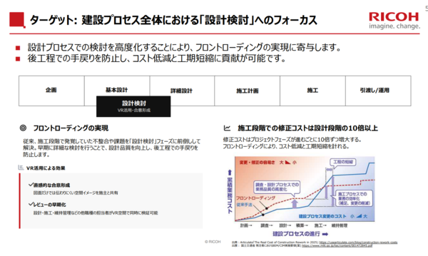 同社はこういった業界の課題に対し、設計プロセスの高度化を図ることでフロントローディング(初期段階への負荷集中)を実現し、手戻りを減らすことができることに着目(図1)。設計検討フェーズにフォーカスした「RICOH Virtual Workplace」を開発した。