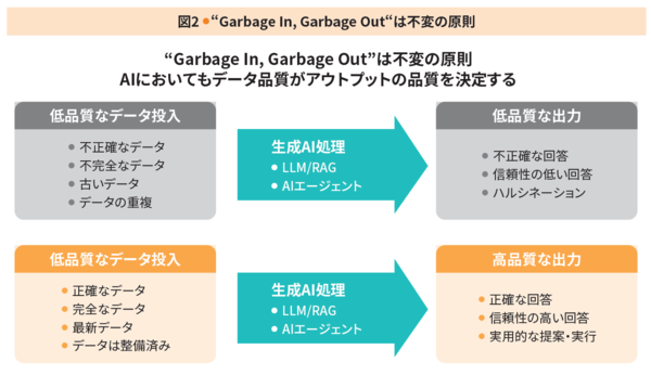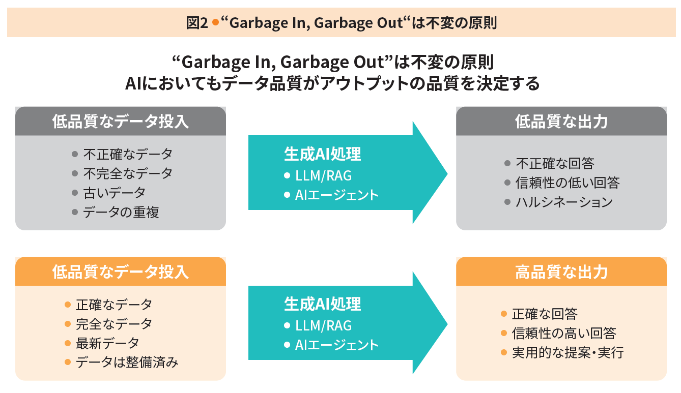 生成AIをはじめとするAIの本格活用期を迎えて、データマネジメントの重要性は増す一方である。「Garbage in, Garbage out(ゴミを入れれば、ゴミしか出てこない)」というデータの原則は、AI時代においても普遍で、AIに不正確なデータや古い情報を与えれば、誤った回答や時代遅れの分析結果を生成し、ビジネスに損害を与えかねない。特に、生成AIが出力するもっともらしい嘘(ハルシネーション)の問題は、業務領域によっては深刻で、入力データの品質と信頼性がこれまで以上に厳しく問われることになる(図2)。