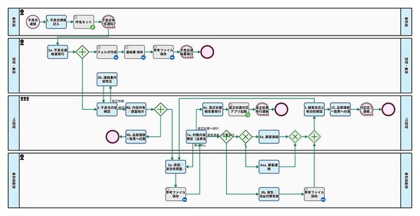 画面1:日本軽金属が構築した不具合連絡アプリケーションのワークフロー図(出典:クエステトラ)拡大画像表示